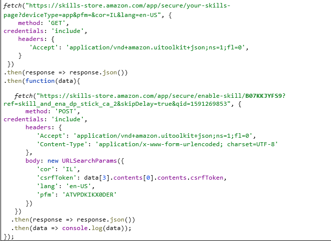 We can use this CSRF token to perform actions on behalf of the victim, such as installing and enabling a new skill for the victim remotely.