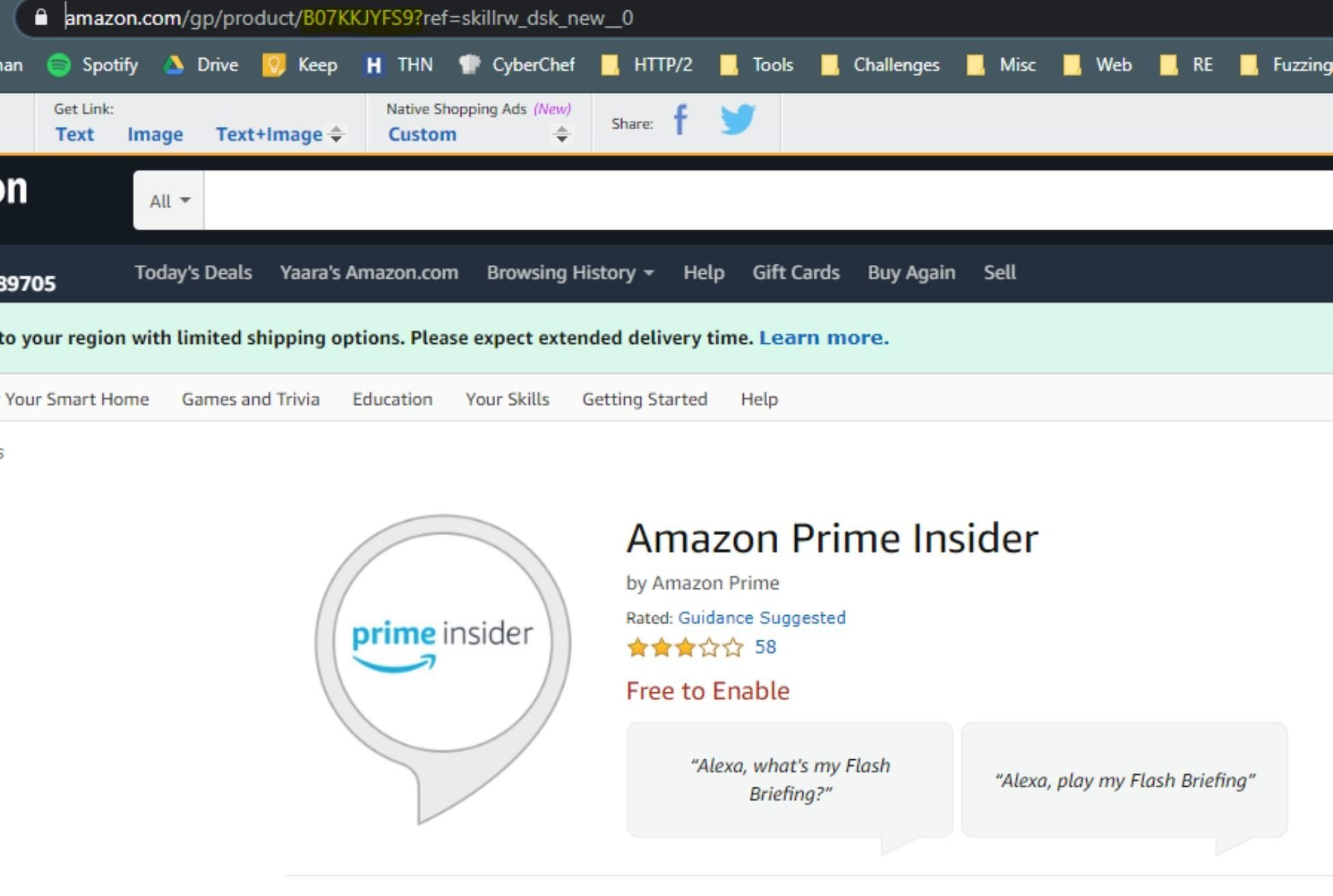 In the POC we installed, the Amazon Prime Insider skill is on the victim’s Alexa account. It’s important to note that Amazon conducts security reviews as part of skill certification, and continually monitors live skills for potentially malicious behavior. Any offending skills that are identified are blocked during certification or quickly deactivated.