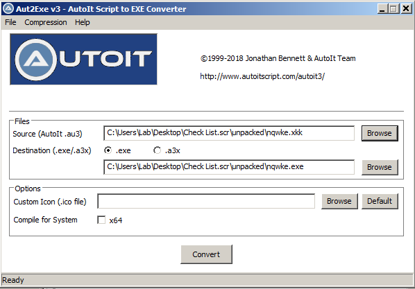 To use a decompiler, a standalone AutoIT script has to be embedded inside the executable so the decompiler can be further applied. To do so, let us use the Aut2Exe Converter: