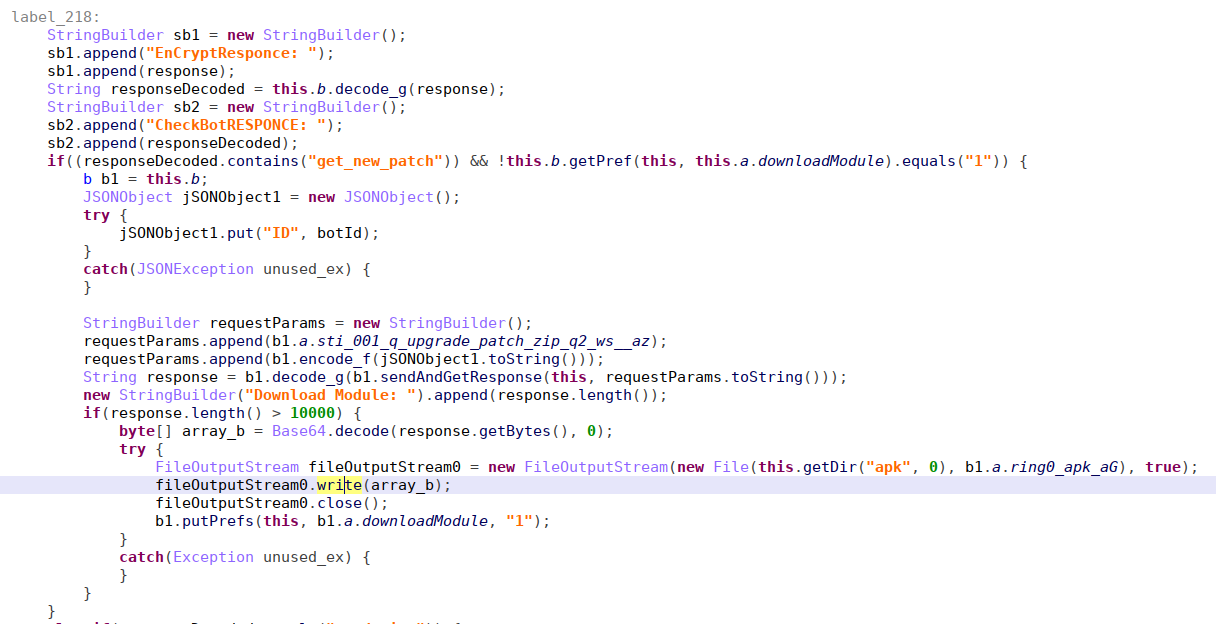 The module can also stop the RAT service responsible for receiving commands from the server. This service can later be restarted by the ring0.apk payload module.