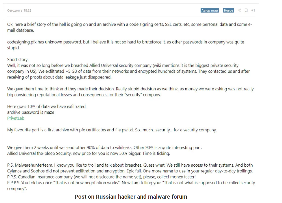 Fig 1: Maze group’s side of the story on a hacking forum (image by BleepingComputer)