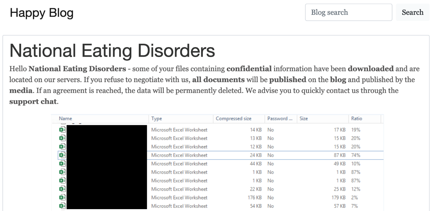 Other cybercriminal groups have followed this new tactic, opening their own sites to publish and leak stolen information as a means to apply additional pressure on their victims to pay ransom. Attackers utilizing Sodinokibi ransomware (aka REvil) published details of their attacks on dozens of targets, as well as proprietary company information stolen from the targeted organizations. The National Eating Disorders Association was one of the last in the list of victim organizations, but has since been deleted from the REvil’s blog.