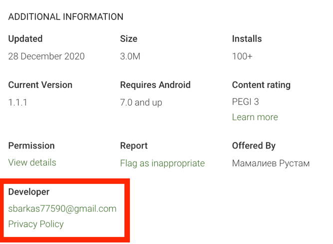 Figure 5 – Developer email and Privacy Policy Links