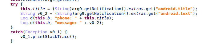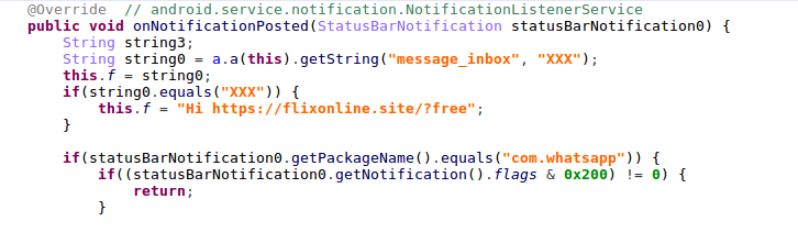 Once this is complete, the malware has everything needed to distribute the payload. With the OnNotificationPosted callback, the malware checks for the package name of the originated application, and if that application is WhatsApp, it will process the notification.