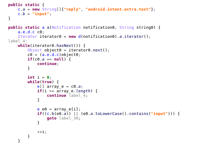 First, the malware cancels the notification to hide it from the user and reads the title and content of the notification received. Next, it searches for the component that is responsible for inline replies, which is used to send out the reply using the payload received from the C&C server.