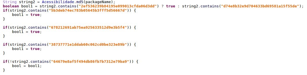 To check if the top running application in the system is a supported banking app, the malware uses a package name. To avoid detection of banking package names strings inside the app, the malware reads the package name, calculates the MD5 checksum, and then compares it with the pre-defined list: