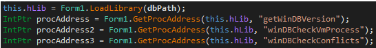 On the other hand, the dburl field in the JSON object contains a URL to download a library called WinDBProject.dll. This library exports three functions that are loaded by the WebAssistant binary: getWinDBVersion, winDBCheckVmProcess, and winDBCheckConflicts.