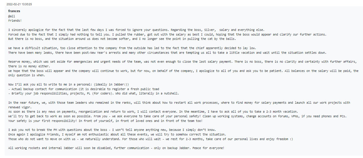 It seems the leak added to the pile of current problems in Conti. As we saw in the chats, the big boss Stern went silent around mid-January, in January-February there we’ve observed multiple reported issues with the salary, and eventually, a few days before the leak Frances in Rocket.Chat tells everyone to take a break for 2-3 months to regroup and reorganize due to wide public attention and the absence of group’s bosses.